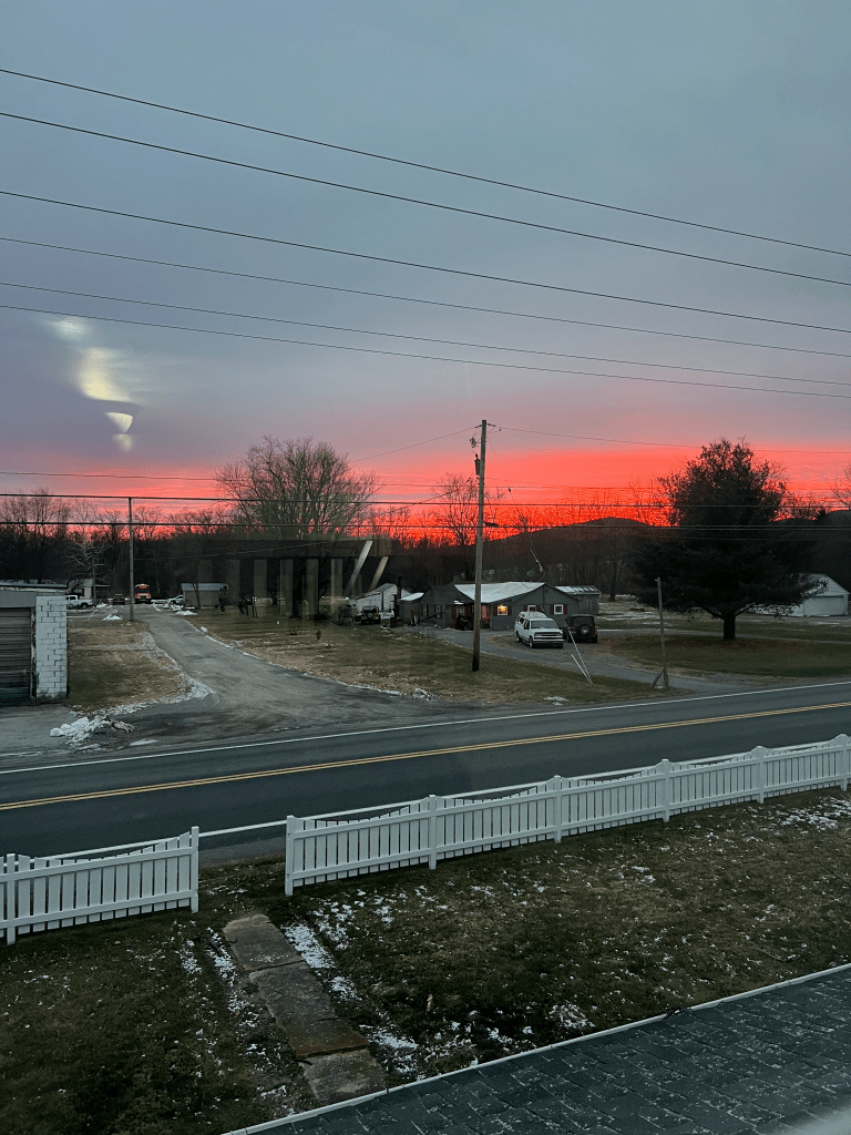 The picture is of a sunset across the mountains out a second story window of our home.